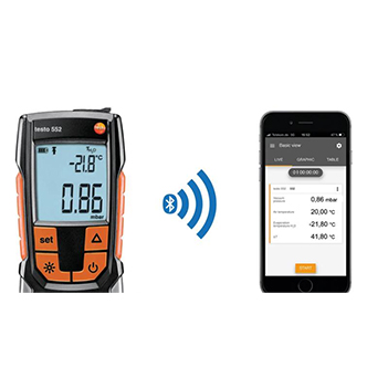 通过蓝牙接口,testo 552与智能设备(手机或平板电脑)上的 testo Smart APP 智能应用程序连接。可以让您便捷地在智能设备上读取测量数据,在现场完成和发送测量报告。